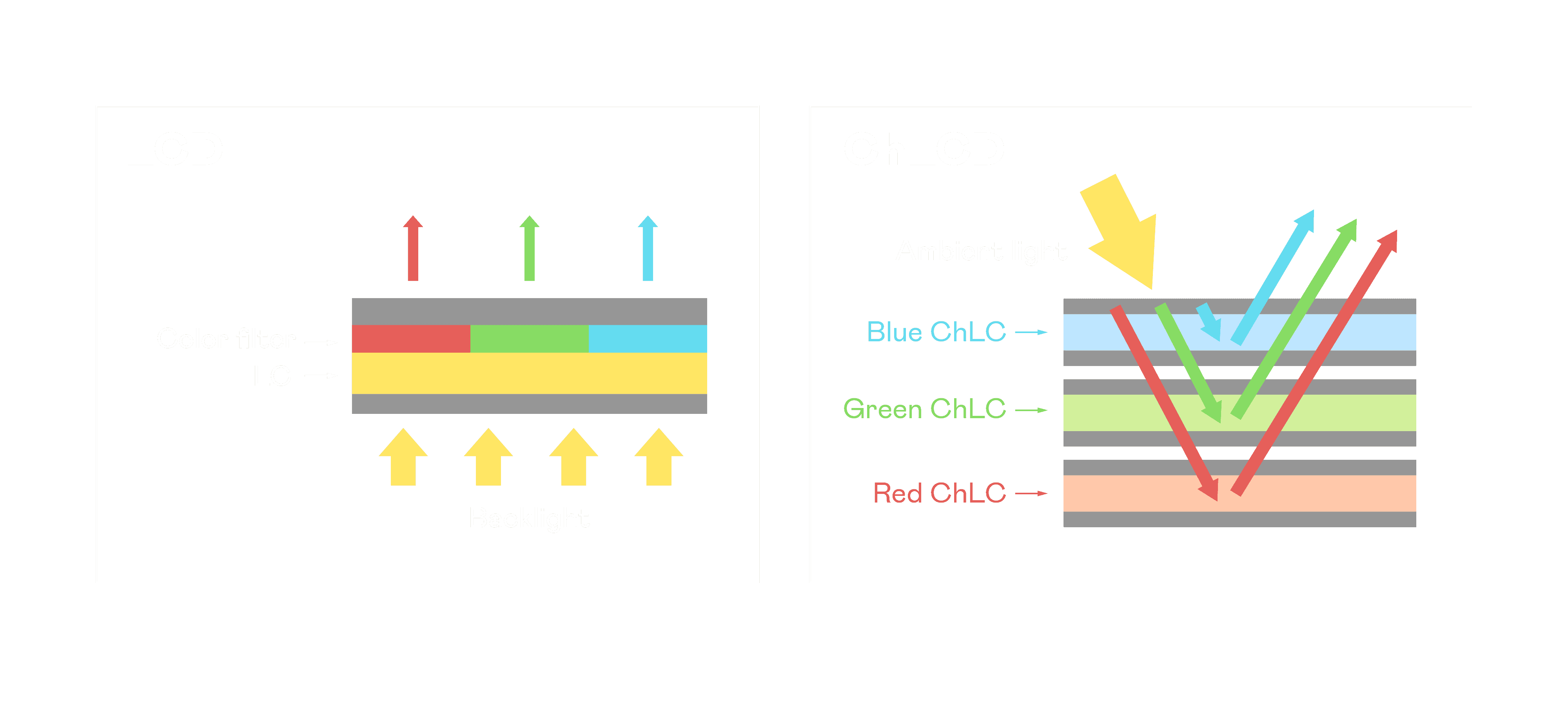 ChLCD 胆固醇液晶就如同纸张一样,,,透过反射环境光来显示影像,,,因此长时间观看不易造成人眼视觉疲劳,,,可达到护眼效果。。。。当处于户外阳光下使用,,,LCD 影像容易失真而不易观看,,但胆固醇液晶仍可维持较佳的影像品质。。。。
